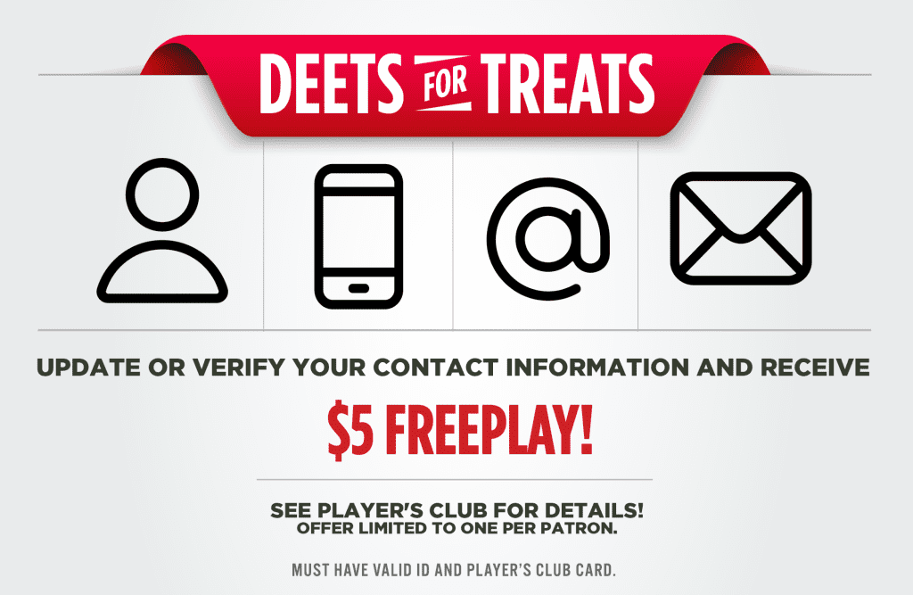 update or verify your contact information and receive $5 freeplay – stop by the player’s club.
